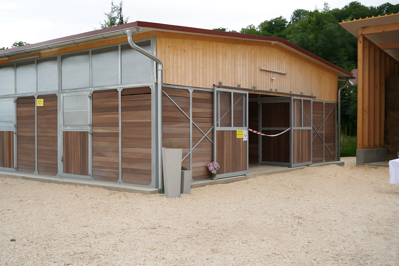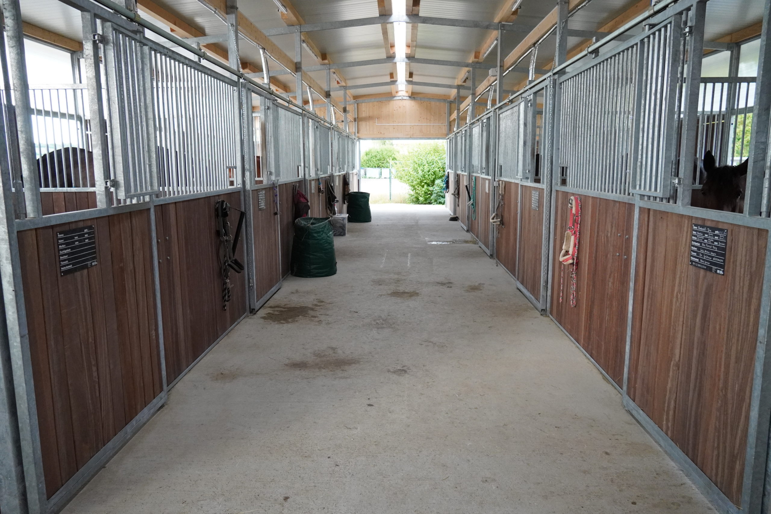 Direkt neben der Reithalle in Burgberg ist 2022 ein Stallgebäude entstanden, das bis zu zehn Pferden Platz bietet. Die großzügigen Boxen verfügen über einen Paddock, der den Tieren Zugang ins Freie und damit große Bewegungsfreiheit bietet. Innen ist der Stallkomplex hell und mit einer Firstentlüftung ausgestattet. Darüber hinaus beinhaltet er einen Speicher für Futtermittel wie Heu, Stroh und Fertigfutter, eine geräumige Sattelkammer sowie eine Dunglege.
